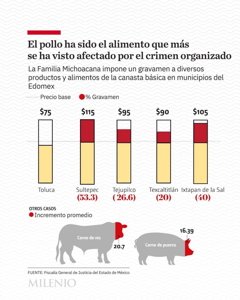 En el Estado de México, por ejemplo, la Familia Michoacana, bajo la dirección de los hermanos Hurtado Olascoaga, impone “impuestos” ilegales sobre productos básicos y materiales de construcción. La Fiscalía General de Justicia del Estado de México (FGJEM) ha documentado incrementos que van desde el 20% hasta más del 300% en algunas localidades.