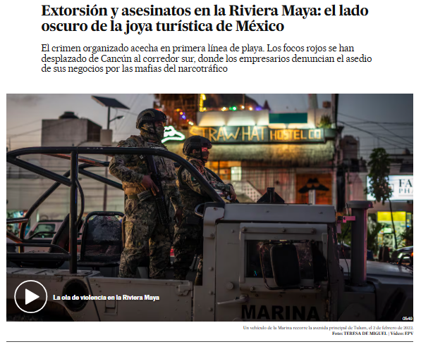 Visuales sugeridos: Titulares de balaceras en zonas turísticas, mapas de presencia criminal, testimonios de trabajadores.